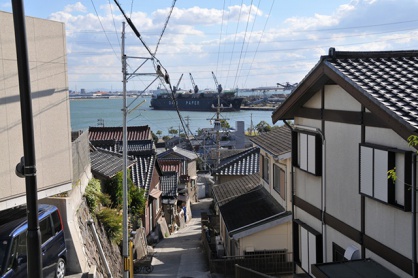‘오자카’(통칭: 다테이시)는 그 중에서도 경관이 매력적인 언덕길로, 민가가 양쪽으로 밀착된 급경사 언덕이 완만한 커브를 그리고 있어 도중에 뒤돌아보면 그곳에는 바다가 보입니다. 옛날에 어업을 생업으로 한 어촌을 방불케 하는 조그만 지붕의 연속. 잔잔한 수면 위에 대형 선박이 정박하는 가메자키항. 왠지 모르게 향수가 느껴지는 풍치에 언제부턴가 ‘가메자키의 오노미치’라고 소개되게 되었습니다.