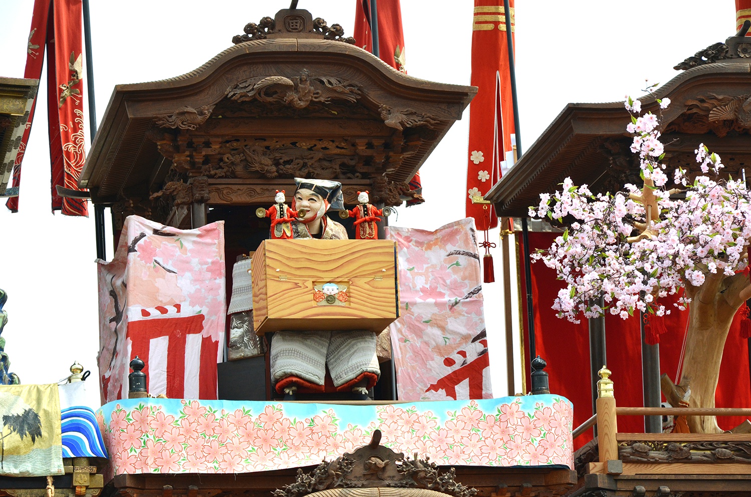 昭和41年に5輌の山車が愛知県有形民俗文化財に指定されたのをきっかけに、亀崎では潮干祭の文化的・歴史的価値を再評価する流れが生まれました。破損や紛失等で永く途絶えていたからくり人形の修復や復元が各山車組で相次いでなされ、現在では5輌すべての山車が前棚・上山の2種類のからくり人形を奉納しています。さらに幕類や彫刻その他の装飾品も盛んに修復や復元が行われ、先人から受け継いだ有形・無形の財産を大切に後世に守り伝えて行こうという意識が年々高まってきました。